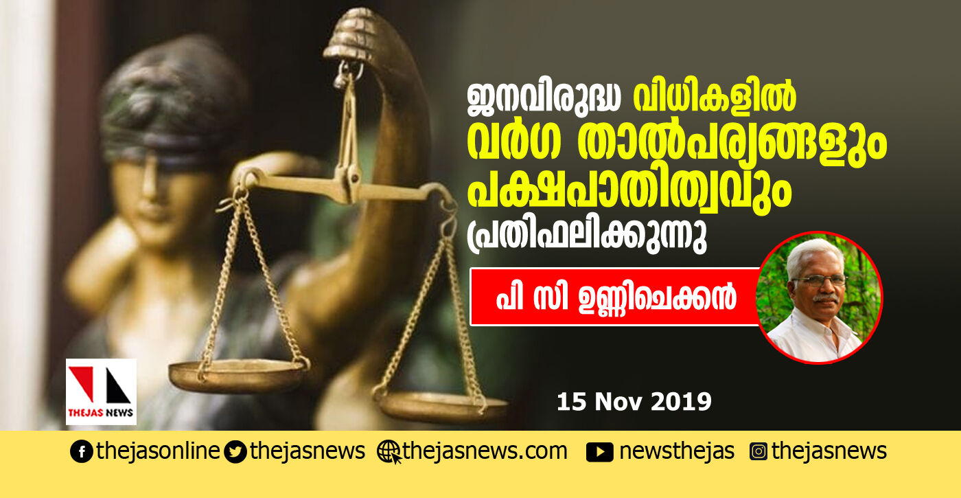 ന്യായാധിപന്മാരുടെ അറിവോ അറിവില്ലായ്മയോ എന്നതിലുപരി അവര് പ്രതിനിധാനം ചെയ്യുന്ന വര്ഗ താല്പര്യങ്ങളും വര്ഗ പക്ഷപാതിത്വവും ആണ് മിക്ക ജനവിരുദ്ധ വിധികളിലും പ്രതിഫലിക്കുന്നതെന്ന് മുന് വിധികളെ തെളിവായി നിരത്തി പി സി ഉണ്ണിച്ചെക്കന് സമര്ത്ഥിക്കുന്നു.