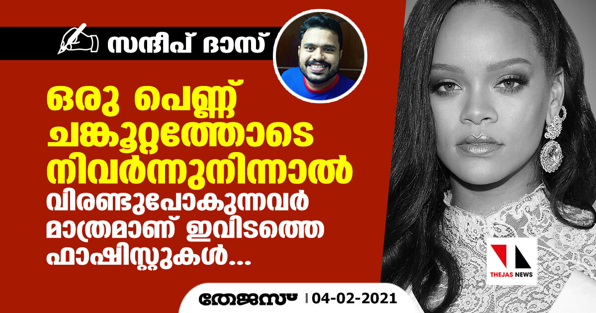 ഇപ്പോള് ഒരു കാര്യം മനസ്സിലായില്ലേ?. ഒരു പെണ്ണ് ചങ്കൂറ്റത്തോടെ നിവര്ന്നുനിന്നാല് വിരണ്ടുപോകുന്നവര് മാത്രമാണ് ഇവിടത്തെ ഫാസിസ്റ്റുകള്. റിഹാന എന്ന പോപ് ഗായിക ഒരൊറ്റ ചോദ്യമേ ചോദിച്ചുള്ളൂ 'ഇന്ത്യയിലെ കര്ഷകസമരത്തെക്കുറിച്ച് നാം എന്തുകൊണ്ട് സംസാരിക്കുന്നില്ല...? 'ഇതോടെ എല്ലാവര്ക്കും നിയന്ത്രണം നഷ്ടപ്പെട്ടു. റിഹാനയ്ക്കെതിരേ ഇന്ത്യയിലെ സെലിബ്രിറ്റികള് വരിവരിയായി രംഗത്തുവന്നു. കങ്കണ റണൗട്ട്, അക്ഷയ് കുമാര്, അജയ് ദേവ്ഗണ്, സുനില് ഷെട്ടി, കരണ് ജോഹര് തുടങ്ങിയ സിനിമാക്കാര്... സച്ചിന് തെന്ഡുല്ക്കര്, സുരേഷ് റെയ്ന, അനില് കുംബ്ലെ, ശിഖര് ധവാന്, ആര് പി സിങ് മുതലായ ക്രിക്കറ്റര്മാര്... റിഹാനയ്ക്കെതിരേ സംസാരിച്ച എല്ലാവര്ക്കും ഒരേ ഭാഷയായിരുന്നു. ഏതാണ്ട് ഒരേ വാക്കുകളും. ആരോ പറഞ്ഞുകൊടുത്ത് എഴുതിച്ചതുപോലെ!.