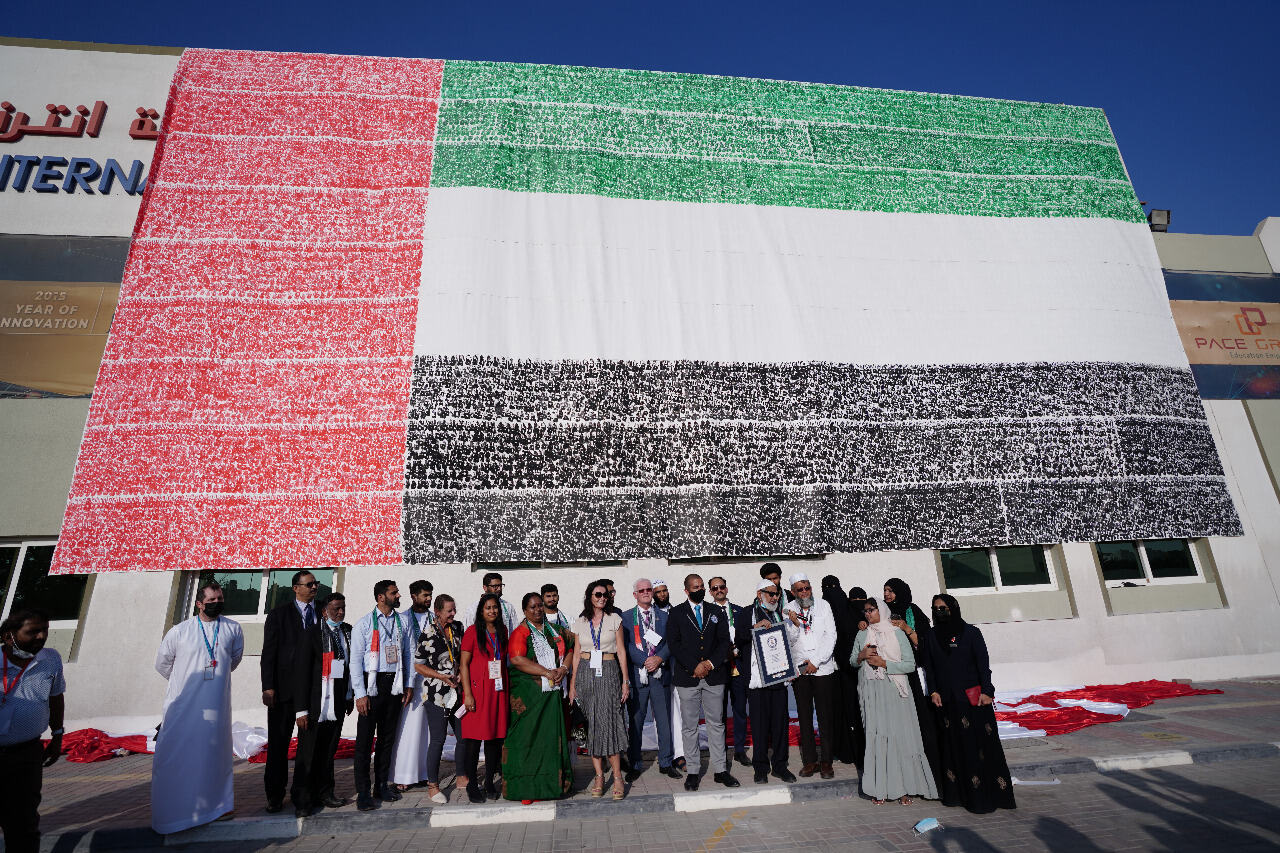 യുഎഇയുടെ 50 മത് ദേശീയ ദിനത്തോടനുബന്ധിച്ച് 64 രാഷ്ട്രങ്ങളില് നിന്നുള്ള 16367 പേര് കൈമുദ്ര പതിച്ച് 9 മീറ്റര് വീതിയും 18 മീറ്റര് നീളവുമുള്ള ചതുര്വര്ണ യു.എ. ഇ പതാക നിര്മ്മിച്ച്് പെയ്സ് എജ്യൂക്കേഷന് ഗ്രൂപ്പ് പുതിയ ഗിന്നസ് റെക്കോര്ഡ് കരസ്ഥമാക്കി. യു എ ഇയിലെ മലയാളികളുടെ ഉടമസ്ഥതയിലുള്ള വിദ്യാഭ്യാസ സംരംഭകരായ പെയ്സ് എജുക്കേഷന് ഗ്രൂപ്പാണ് വീണ്ടുമൊരു ഗിന്നസ് റെക്കോഡ് കൂടി കരസ്ഥമാക്കിയത്