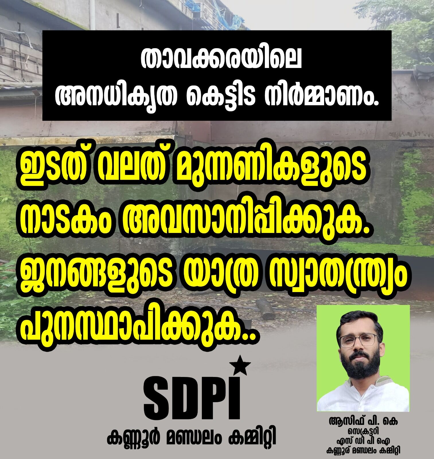*താവക്കരയിലെ അനധികൃത കെട്ടിട നിർമ്മാണം. ഇടത് വലത് മുന്നണികളുടെ നാടകം അവസാനിപ്പിക്കുക. ജനങ്ങളുടെ യാത്ര സ്വാതന്ത്ര്യം പുനസ്ഥാപിക്കുക..എസ്ഡിപിഐ*
