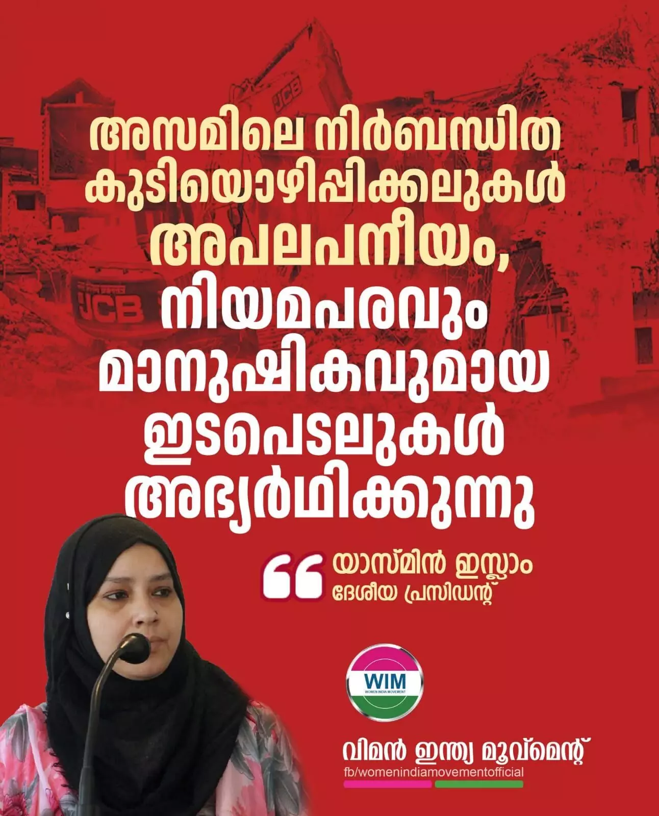അസമിലെ നിർബന്ധിത കുടിയൊഴിപ്പിക്കലുകൾ അപലപനീയം; നിയമപരവും മാനുഷികവുമായ ഇടപെടലുകൾ അഭ്യർഥിക്കുന്നു - 'യാസ് മീൻ ഇസ്ലാം' - ദേശീയ പ്രസിഡണ്ട് വിമന് ഇന്ത്യ മൂവ്മെൻറ്)