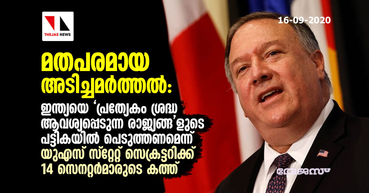 മതപരമായ അടിച്ചമര്ത്തല്: ഇന്ത്യയെ 'പ്രത്യേകം ശ്രദ്ധ ആവശ്യപ്പെടുന്ന രാജ്യങ്ങ'ളുടെ പട്ടികയില് പെടുത്തണമെന്ന് യുഎസ് സ്റ്റേറ്റ് സെക്രട്ടറിക്ക് 14 സെനറ്റര്മാരുടെ കത്ത്