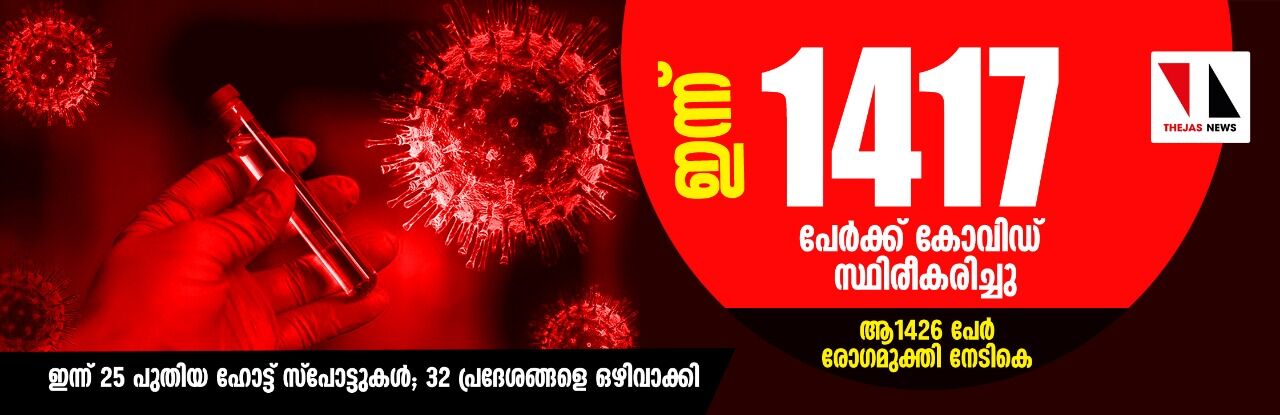 സംസ്ഥാനത്ത് ഇന്ന് 1,417 പേര്ക്ക് കൊവിഡ്-19 സ്ഥിരീകരിച്ചു; 1,426 പേര്ക്ക് രോഗമുക്തി; ചികില്സയിലുള്ളത് 12,721 പേര്