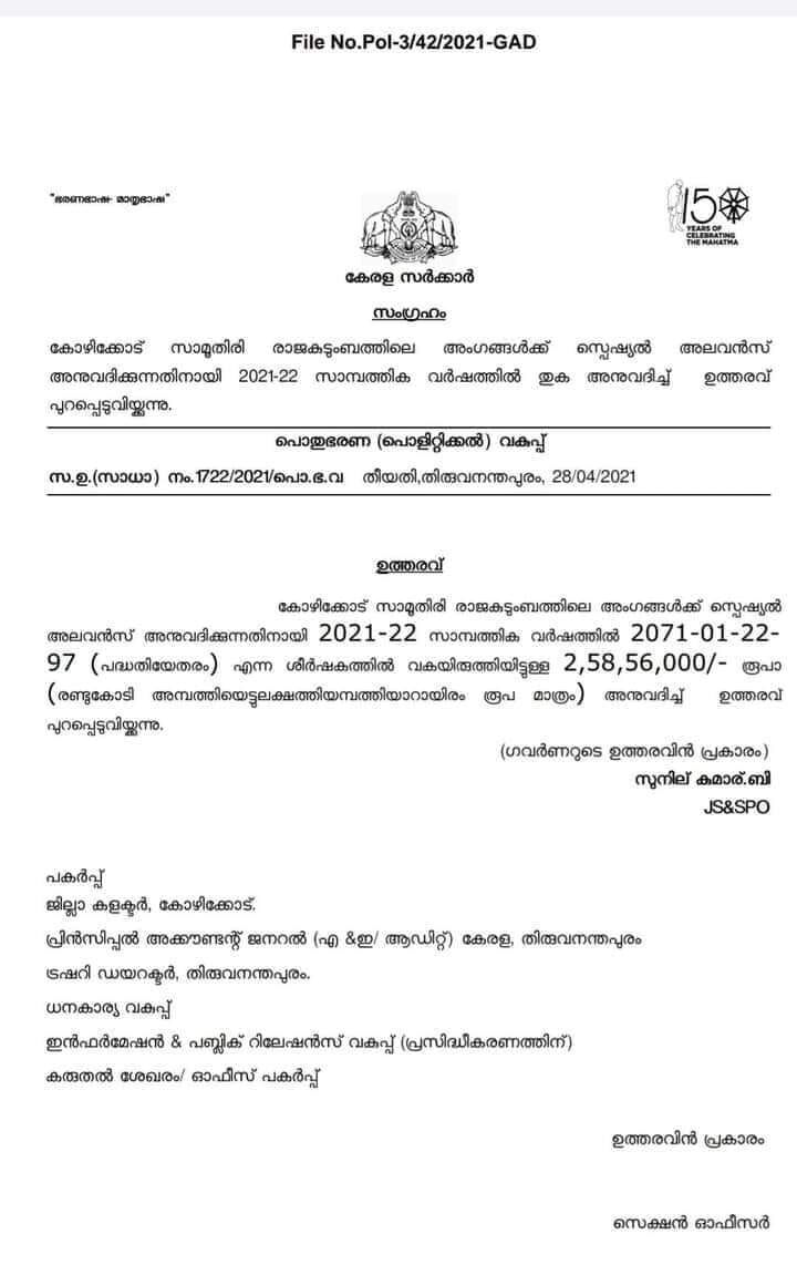 സാമൂതിരി രാജകുടുംബത്തിന് സ്പെഷ്യല് അലവന്സായി 2.5 കോടി രൂപ; പരിഹാസവുമായി സാമൂഹികമാധ്യമങ്ങള്