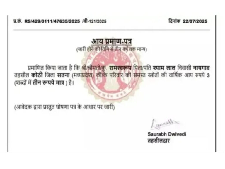 സത്ന ജില്ലയിലെ നയാഗാവോണ് ഗ്രാമത്തില് താമസിക്കുന്ന 45 വയസ്സുള്ള രാംസ്വരൂപിന് നല്കിയ സര്ട്ടിഫിക്കറ്റില് അദ്ദേഹത്തിന്റെ വാര്ഷിക വരുമാനം വെറും 3 രൂപയാണെന്ന് രേഖപ്പെടുത്തിയിരുന്നു.അതായത് പ്രതിമാസം ഏകദേശം 25 പൈസ.