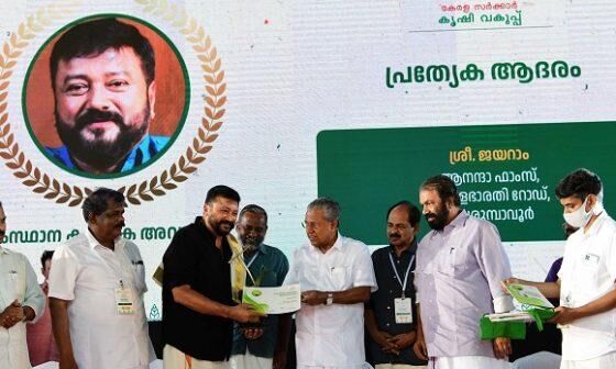 ചടങ്ങില് മുഖ്യമന്ത്രി പിണറായി വിജയന് ജയറാമിനെ പൊന്നാട അണിയിച്ചു. വിവിധ വിഭാഗങ്ങളിലെ കര്ഷക അവാര്ഡുകള് മുഖ്യമന്ത്രി സമ്മാനിച്ചു.