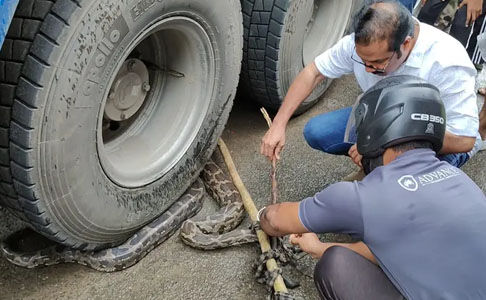 ലോറിയുടെ ടയറില് കുരുങ്ങിയ മലമ്പാമ്പിനെ രക്ഷപ്പെടുത്തി