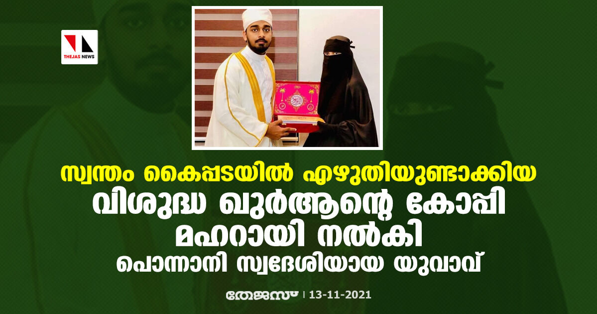 സ്വന്തം കൈപ്പടയില് എഴുതിയുണ്ടാക്കിയ വിശുദ്ധ ഖുര്ആന്റെ കോപ്പി മഹറായി നല്കി പൊന്നാനി സ്വദേശിയായ യുവാവ്
