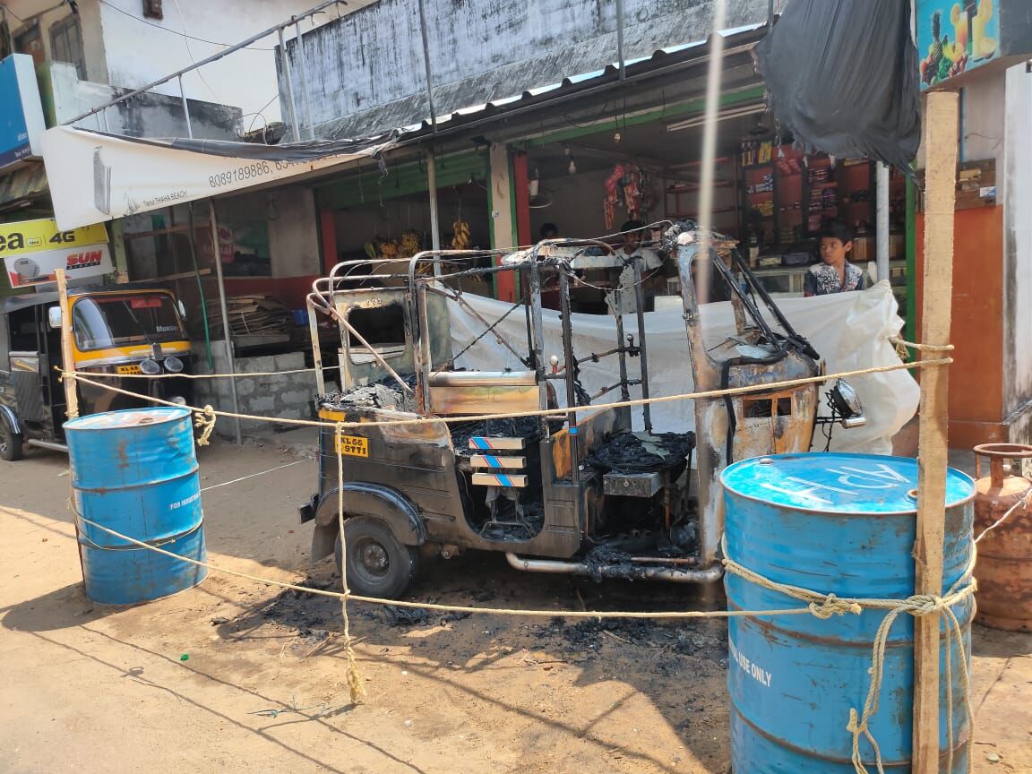 താഹാ ബീച്ചില് ഹാരിസിന്റെ ഉടമസ്ഥതയിലുള്ള ക്രസന്റ് ബേക്കറിക്കു മുന്നിലാണ് ഓട്ടോ നിര്ത്തിയിട്ടിരുന്നത്. രാത്രി കടയടച്ച് വീട്ടിലേക്ക് പോന്നതായിരുന്നു. തുടര്ച്ചയായി ഹോണടിക്കുന്ന ശബ്ദം കേട്ട് കടയുടെ സമീപത്തെ വീട്ടുകാര് ഉണര്ന്നപ്പോഴാണ് സംഭവം അറിയുന്നത്. ഓട്ടോയില് നിന്ന് തീ പടര്ന്ന് കടയുടെ നെയിംബോര്ഡും നശിച്ചു.