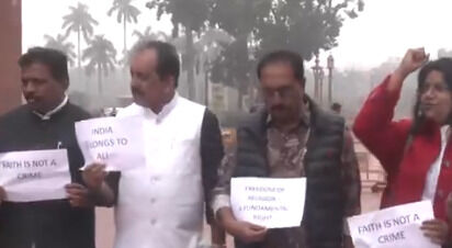 ന്യൂനപക്ഷങ്ങള്ക്കെതിരായ അതിക്രമങ്ങള് അവസാനിപ്പിക്കണം; പാര്ലമെന്റ് വളപ്പില് പ്രതിപക്ഷ പ്രതിഷേധം (വീഡിയോ)