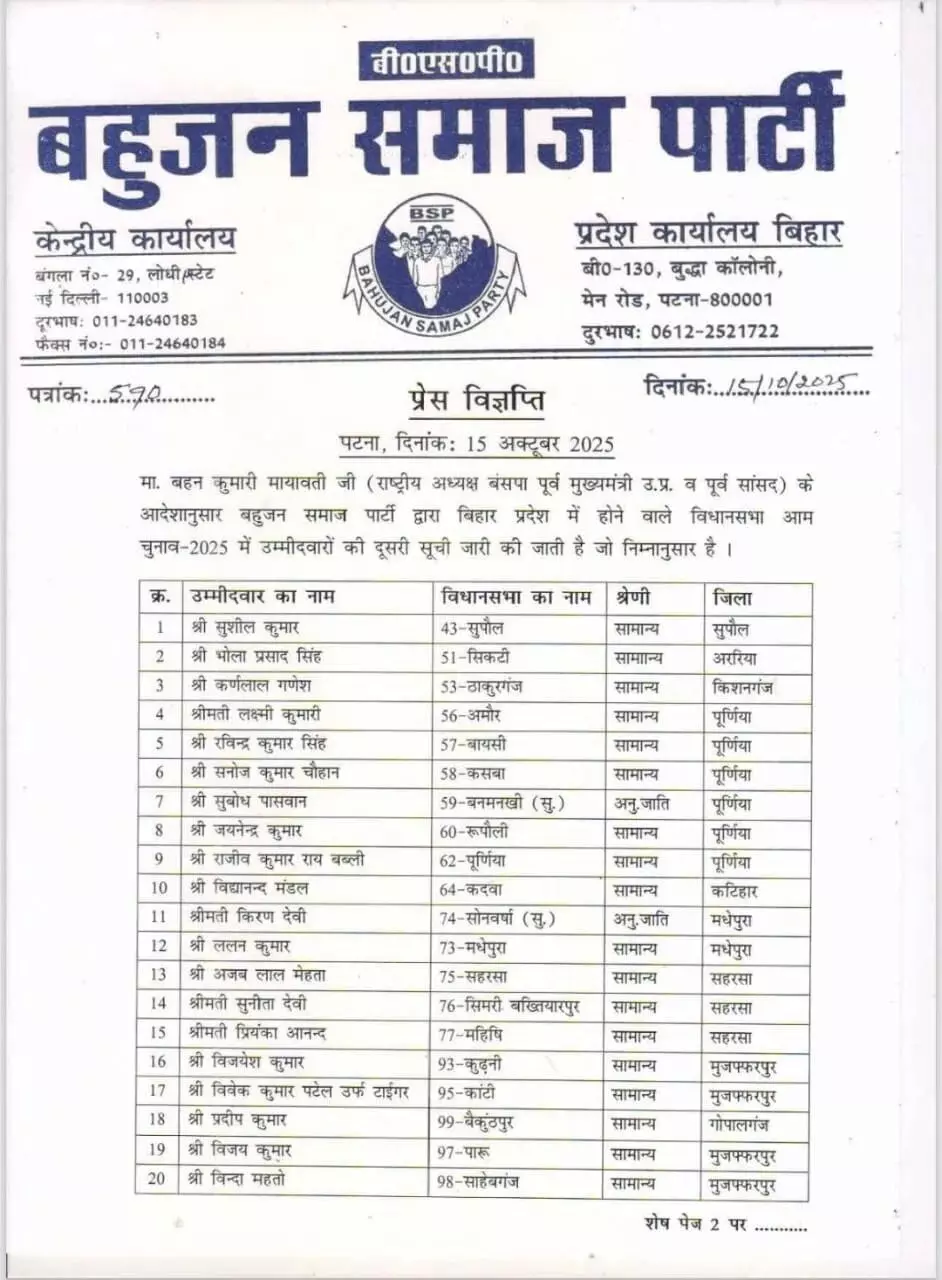 ബീഹാര് നിയമസഭാ തിരഞ്ഞെടുപ്പ്; സ്ഥാനാര്ഥികളുടെ പട്ടിക പുറത്തുവിട്ട് ബിഎസ്പി