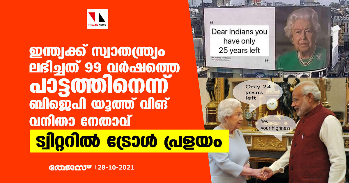 ''ഇന്ത്യക്ക് സ്വാതന്ത്ര്യം ലഭിച്ചത് 99 വര്ഷത്തെ പാട്ട''ത്തിനെന്ന് ബിജെപി യൂത്ത് വിങ് വനിതാ നേതാവ്; ട്വിറ്ററില് ട്രോള് പ്രളയം