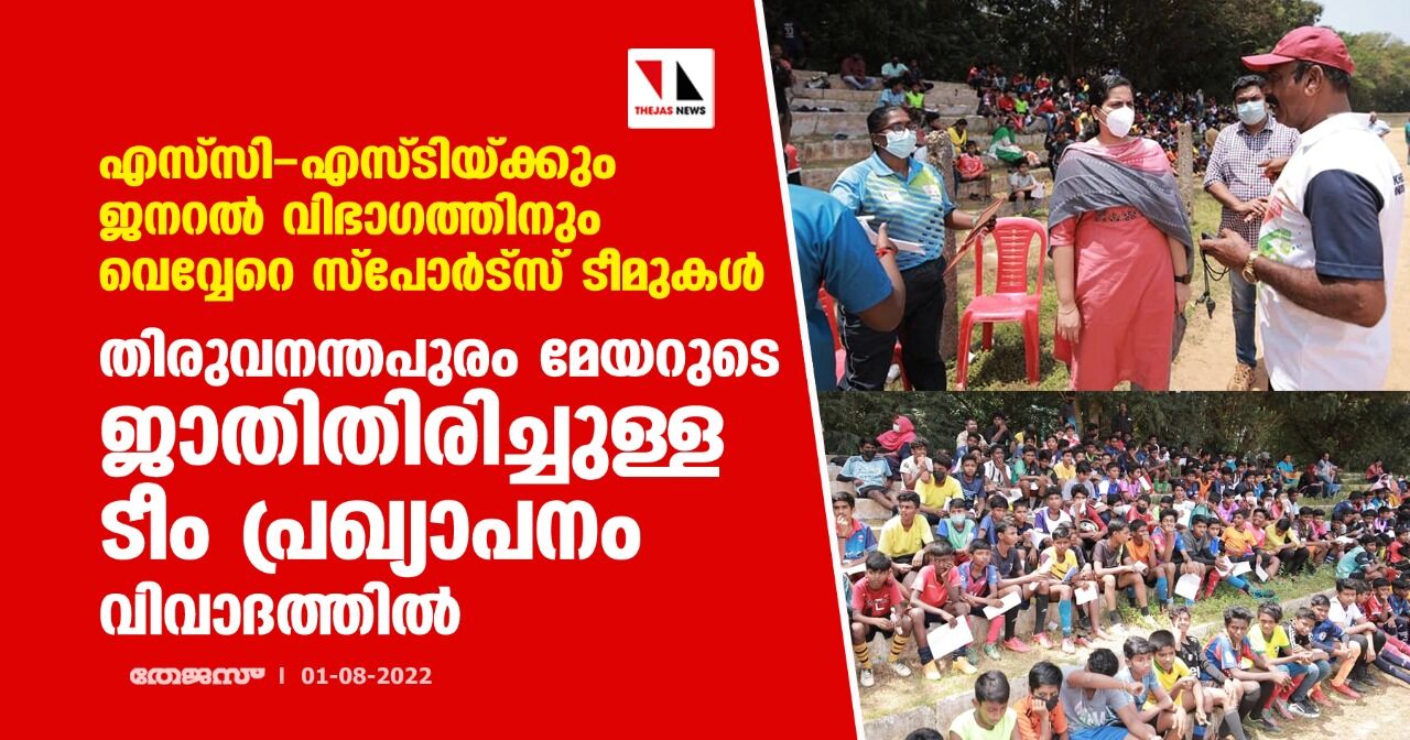 തിരുവനന്തപുരം കോര്പറേഷന്റെ നേതൃത്വത്തിലാണ് ജാതി തിരിച്ച് സ്പോര്ട്ട്സ് ടീം പ്രഖ്യാപിച്ചത്