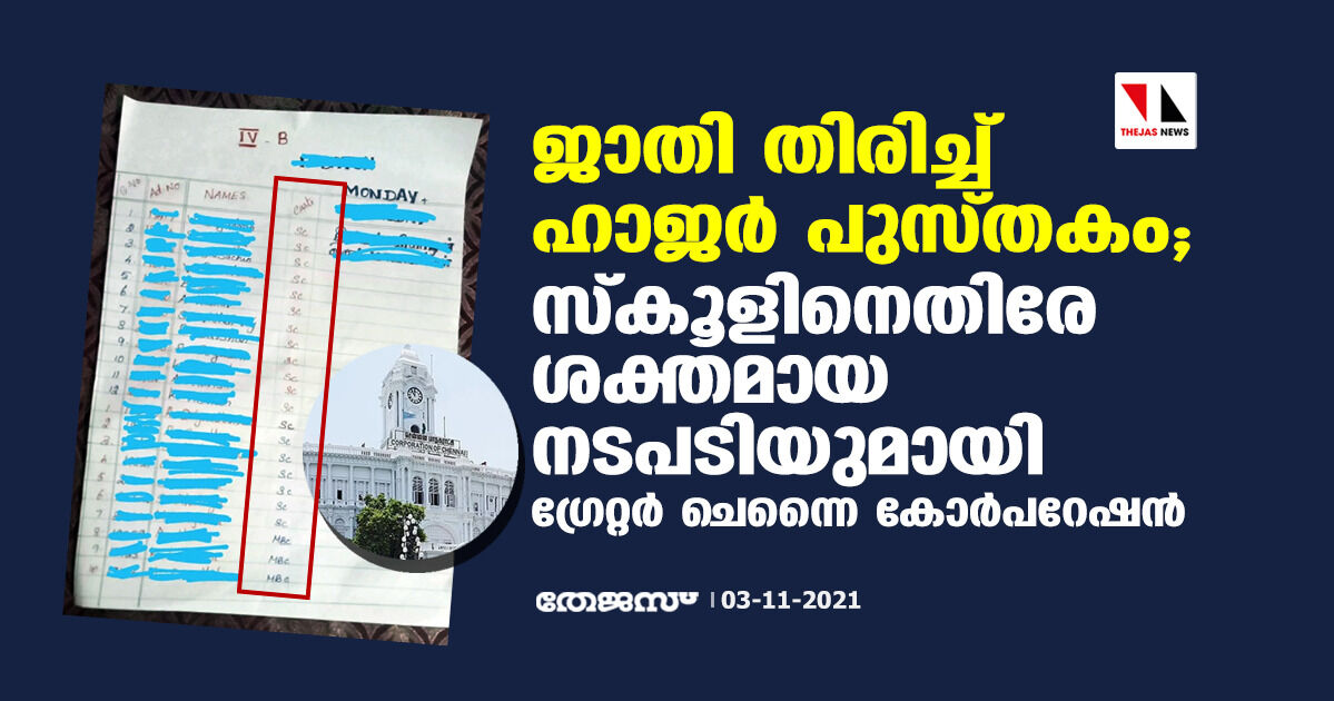 ജാതി തിരിച്ച് ഹാജര് പുസ്തകം; സ്കൂളിനെതിരേ ശക്തമായ നടപടിയുമായി ഗ്രേറ്റര് ചെന്നൈ കോര്പറേഷന്