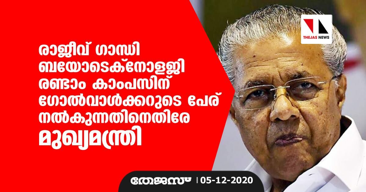 രാജീവ് ഗാന്ധി ബയോടെക്നോളജി രണ്ടാം കാമ്പസിന് ഗോല്വാള്ക്കറുടെ പേര് നല്കുന്നതിനെതിരേ മുഖ്യമന്ത്രിയുടെ കത്ത്