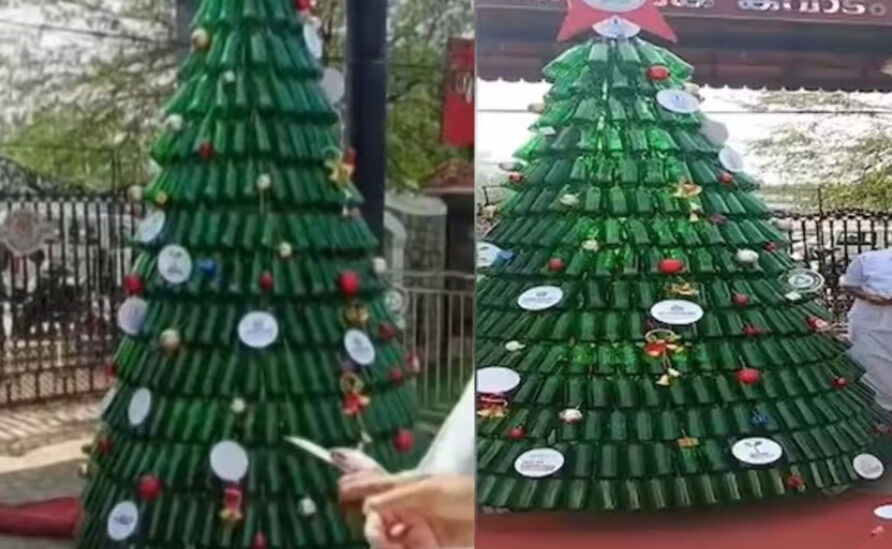ഗുരുവായൂര് നഗരസഭയില് ബിയര് കുപ്പികള് കൊണ്ട് ക്രിസ്മസ് ട്രീ, പ്രതിഷേധം