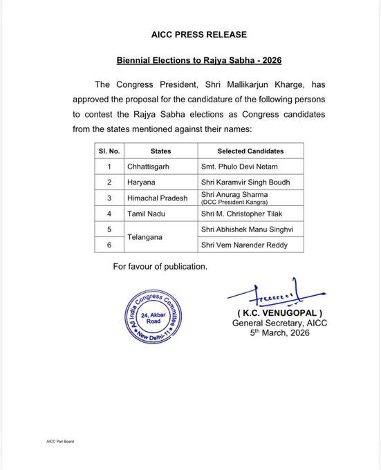 തെലങ്കാനയില് നിന്ന് മുതിര്ന്ന നേതാവ് അഭിഷേക് മനു സിംഗ്വിയും, വേം നരേന്ദര് റെഡ്ഢിയും മല്സരിക്കും. ഛത്തീസ്ഗഡില് നിന്ന് ഫൂലോ ദേവി നേതം, ഹരിയാനയില് നിന്ന് കരംവീര് സിങ് ബൗദ്, ഹിമാചല് പ്രദേശില് നിന്ന് അനുരാഗ് ശര്മ്മ, തമിഴ്നാടില് നിന്ന് ക്രിസ്റ്റഫര് തിലക് എന്നിവര് മല്സരിക്കുമെന്നാണ് റിപോര്ട്ടുകള്