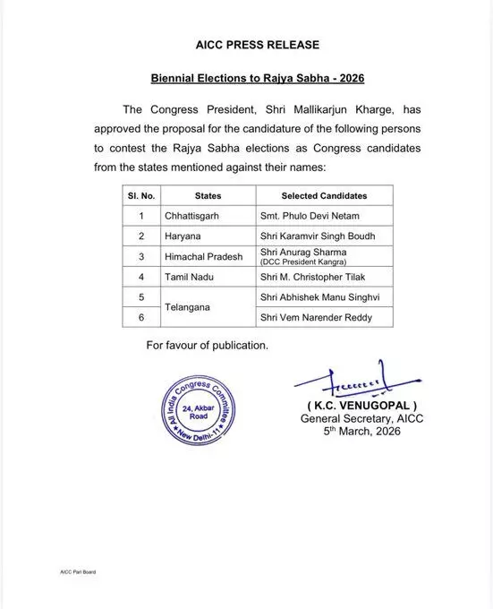 രാജ്യസഭാ സീറ്റുകളിലേക്ക് കോണ്ഗ്രസ് സ്ഥാനാര്ഥികളെ പ്രഖ്യാപിച്ചു