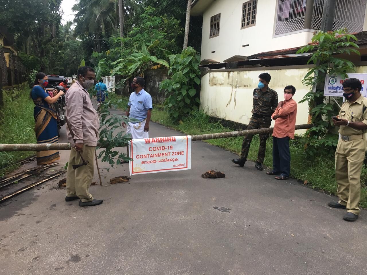 പടം :പരപ്പനങ്ങാടി മുനിസിപ്പാലിറ്റിയില് കണ്ടയ്ന്മെന്റ സോണായി പ്രഖ്യാപിച്ച 7ാം ഡിവിഷനിലേക്കുള്ള വഴി പോലീസും നാട്ടുകാരും ചേര്ന്ന് അടക്കുന്നു