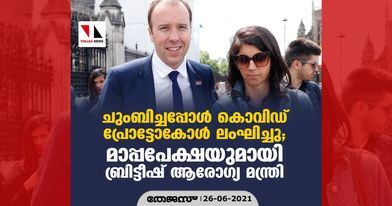 ചുംബിച്ചപ്പോള് കൊവിഡ് പ്രോട്ടോകോള് ലംഘിച്ചു; മാപ്പപേക്ഷയുമായി ബ്രിട്ടീഷ് ആരോഗ്യ മന്ത്രി