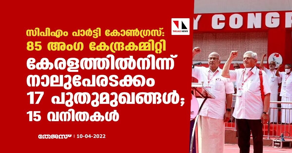 സിപിഎം പാര്ട്ടികോണ്ഗ്രസ്: 85 അംഗ കേന്ദ്രകമ്മിറ്റി: കേരളത്തില്നിന്ന് നാല്പേരടക്കം 17 പുതുമുഖങ്ങള്; 15 വനിതകള്