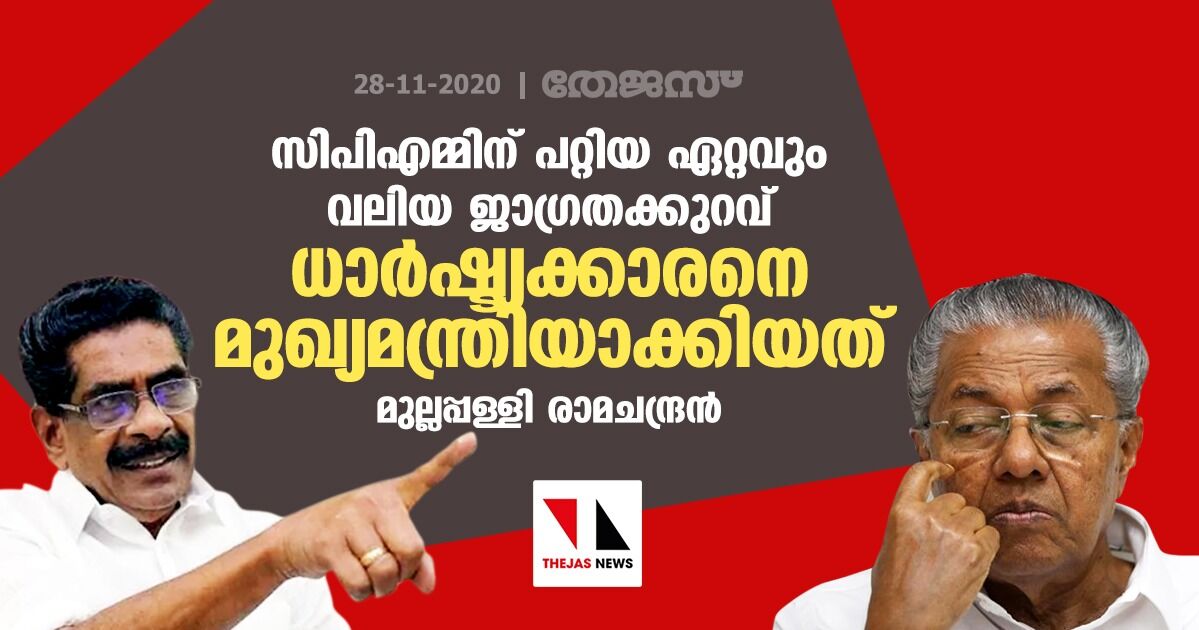 സിപിഎമ്മിന് പറ്റിയ ഏറ്റവും വലിയ ജാഗ്രതക്കുറവ് ധാര്ഷ്ട്യക്കാരനെ മുഖ്യമന്ത്രിയാക്കിയത്: മുല്ലപ്പള്ളി രാമചന്ദ്രന്