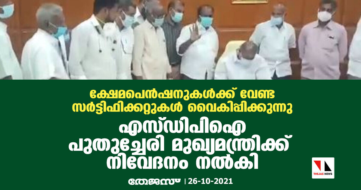 ക്ഷേമപെന്ഷനുകള്ക്ക് വേണ്ട സര്ട്ടിഫിക്കറ്റുകള് വൈകിപ്പിക്കുന്നു; എസ്ഡിപിഐ പുതുച്ചേരി മുഖ്യമന്ത്രിക്ക് നിവേദനം നല്കി