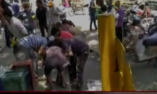 ഡല്ഹിയില് യാത്രക്കാര് ഒരു തെരുവ് കച്ചവടക്കാരന്റെ പഴക്കുട്ടകള് കൊള്ളയടിച്ചു