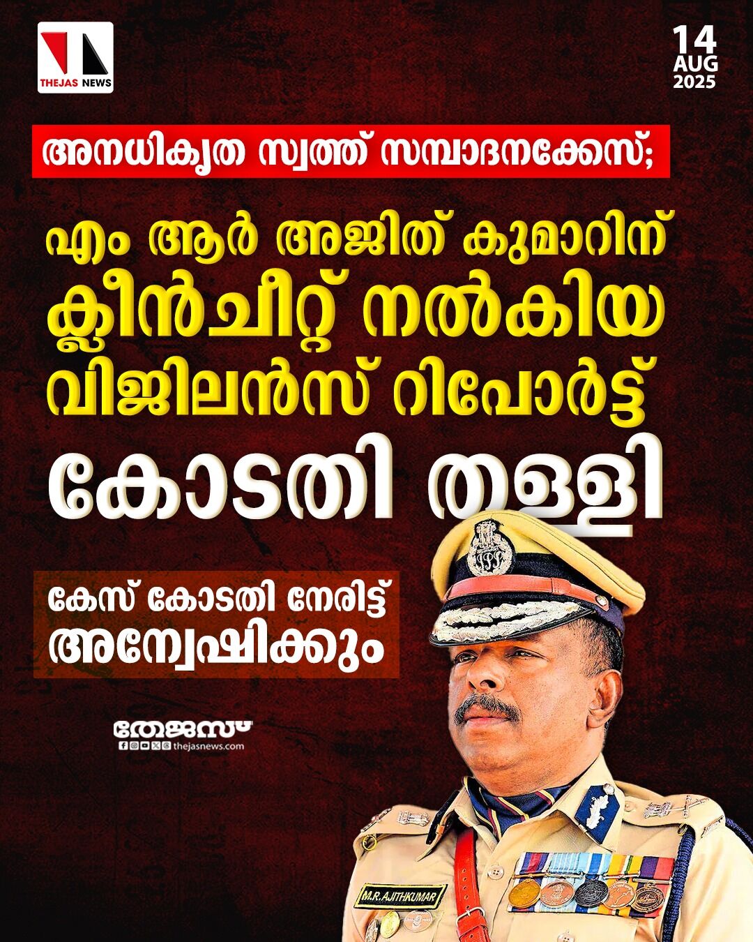 അനധികൃത സ്വത്ത് സമ്പാദനക്കേസ്; എം ആര് അജിത് കുമാറിന് ക്ലീന്ചീറ്റ് നല്കിയ വിജിലന്സ് റിപോര്ട്ട് കോടതി തള്ളി