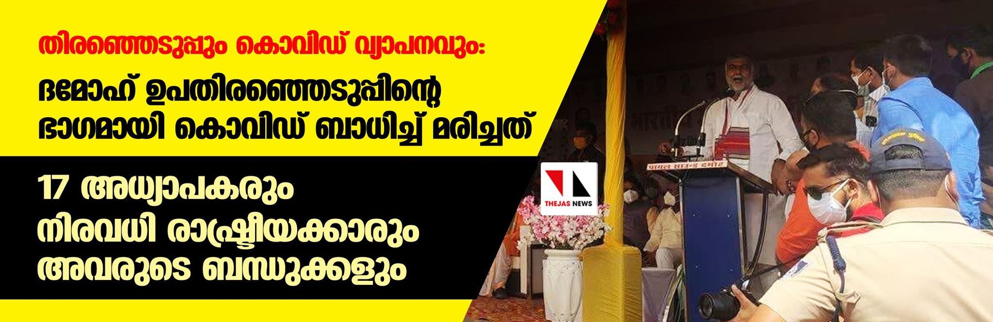 തിരഞ്ഞെടുപ്പും കൊവിഡ് വ്യാപനവും: ദമോഹ് ഉപതിരഞ്ഞെടുപ്പിന്റെ ഭാഗമായി കൊവിഡ് ബാധിച്ച് മരിച്ചത് 17 അധ്യാപകരും നിരവധി രാഷ്ട്രീയക്കാരും അവരുടെ ബന്ധുക്കളും