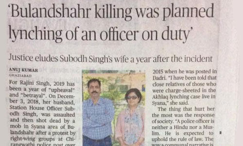 മൂന്നു വർഷം കഴിഞ്ഞ് 2018 ഡിസംബർ 3-ന്, ബജ്രംഗ്ദളിന്റെയും ബിജെപിയുടെയും പ്രാദേശികനേതൃത്വം ഇളക്കിവിട്ട ഒരു ആൾക്കൂട്ടം, യുപിയിലെ ബുലന്ദ്ഷഗറിൽ ഡ്യൂട്ടിയിലായിരുന്ന സുബോധ് സിങ്ങിനെ, അദ്ദേഹത്തിന്റെ തന്നെ റിവോൾവർ പിടിച്ചു വാങ്ങി വെടിവച്ചു കൊന്നു.