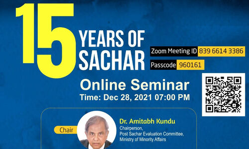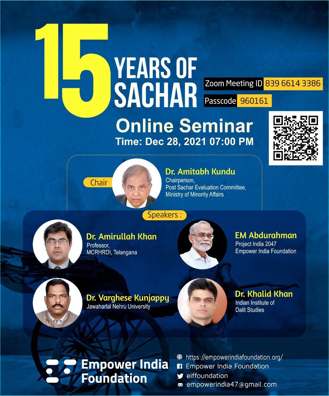 ന്യൂഡല്ഹി: എംപവര് ഇന്ത്യ ഫൗണ്ടേഷന് സംഘടിപ്പിക്കുന്ന 'സച്ചാറിന്റെ പതിഞ്ച് വര്ഷങ്ങള്' സെമിനാര് ഇന്ന് വൈകീട്ട് ഏഴ് മണിക്ക് (ഡിസംബര് 28, 2021)നടക്കും. ഓണ്ലൈനായാണ് പരിപാടി നടക്കുന്നത്.