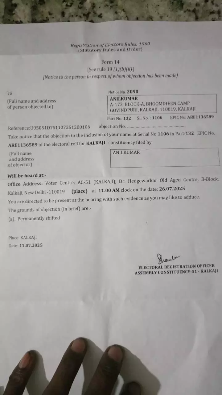 'എന്റെ വീട്ടുനമ്പര് പൂജ്യം ആണെന്ന് പറഞ്ഞ് തിരഞ്ഞെടുപ്പ് കമ്മീഷന് എന്റെ പേര് നീക്കം ചെയ്തു. 2017 ല് പ്രാദേശിക രാഷ്ട്രീയ അംഗങ്ങള് എന്റെ പേര് ബീഹാര് വോട്ടര് പട്ടികയില് ചേര്ത്തിരുന്നു. ഞാന് ഒരിക്കലും അവിടെ വോട്ട് ചെയ്തിട്ടില്ല. എന്റെ പേര് അവിടെ വോട്ടര് പട്ടികയില് ചേര്ത്തിട്ടുണ്ടെന്ന് എനിക്കറിയില്ലായിരുന്നു. 2008 മുതല് ഞാന് ഡല്ഹി വോട്ടര് പട്ടികയില് ഉണ്ട്. ബീഹാറിലെ സ്പെഷ്യല് ഇന്റന്സീവ് റിവിഷന് പ്രകാരം ഞാന് ഒരു കുടിയേറ്റക്കാരനായതിനാല് എന്റെ പേര് നീക്കം ചെയ്യപ്പെട്ടു. ഇപ്പോള് എന്റെ വിലാസം കാരണം ഡല്ഹി പട്ടികയില് നിന്ന് നീക്കം ചെയ്യപ്പെട്ടു,' തെക്കുകിഴക്കന് ഡല്ഹിയിലെ ഭൂമിഹീന് ക്യാമ്പിലുള്ള അനില്സിങ് പറഞ്ഞു.