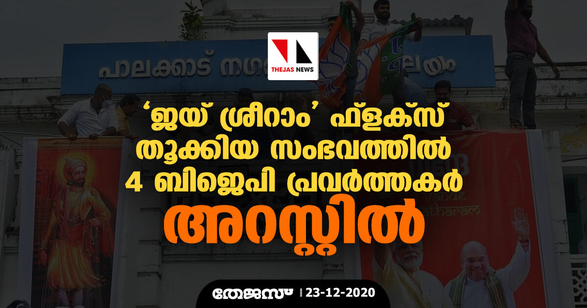 ജയ് ശ്രീറാം ഫ്ളക്സ് തൂക്കിയ സംഭവത്തില് 4 ബിജെപി പ്രവര്ത്തകര് അറസ്റ്റില്