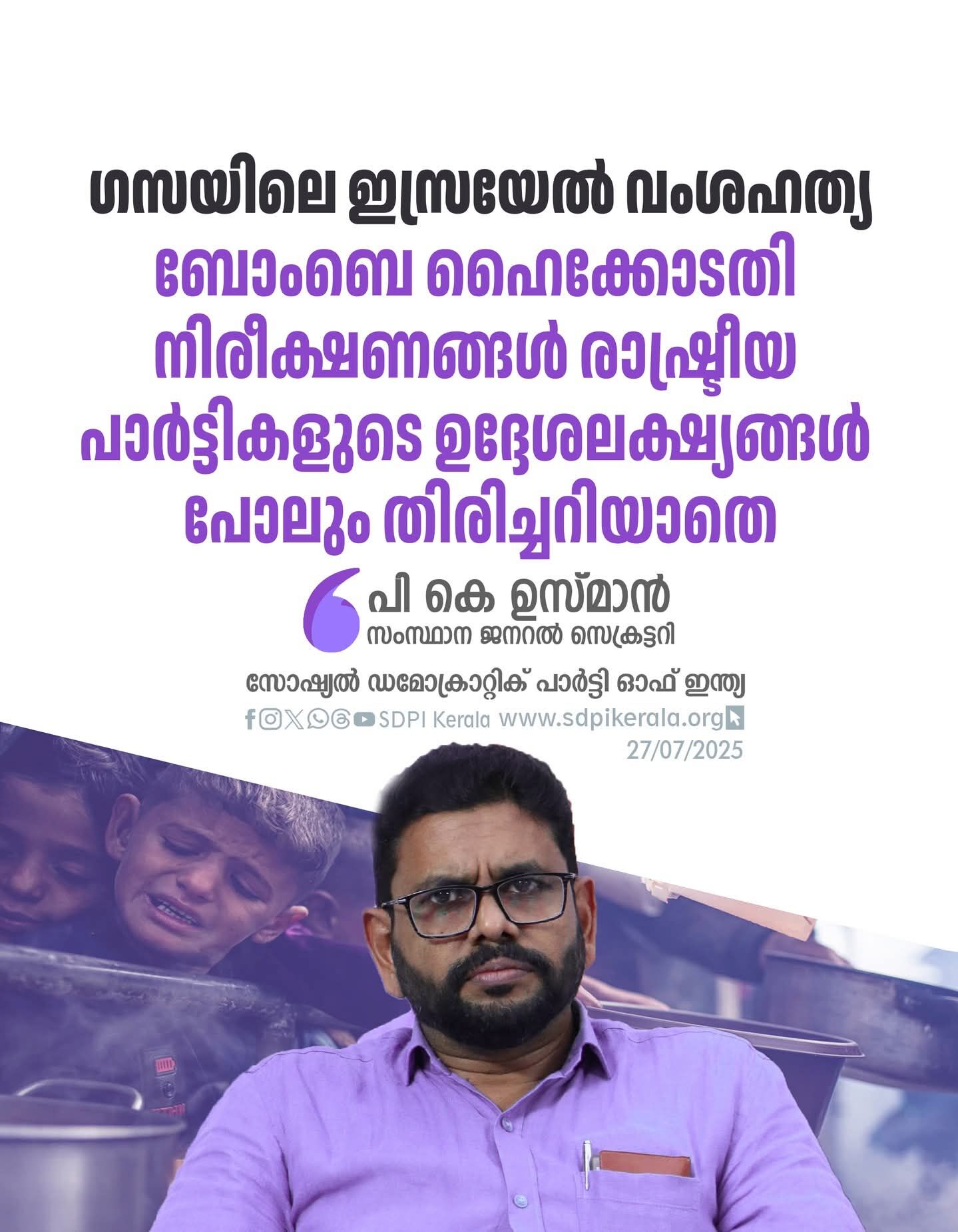 ഗസയിലെ ഇസ്രയേല് വംശഹത്യ; ബോംബെ ഹൈക്കോടതി നിരീക്ഷണങ്ങള് രാഷ്ട്രീയ പാര്ട്ടികളുടെ ഉദ്ദേശലക്ഷ്യങ്ങള് പോലും തിരിച്ചറിയാതെ: പി കെ ഉസ്മാന്