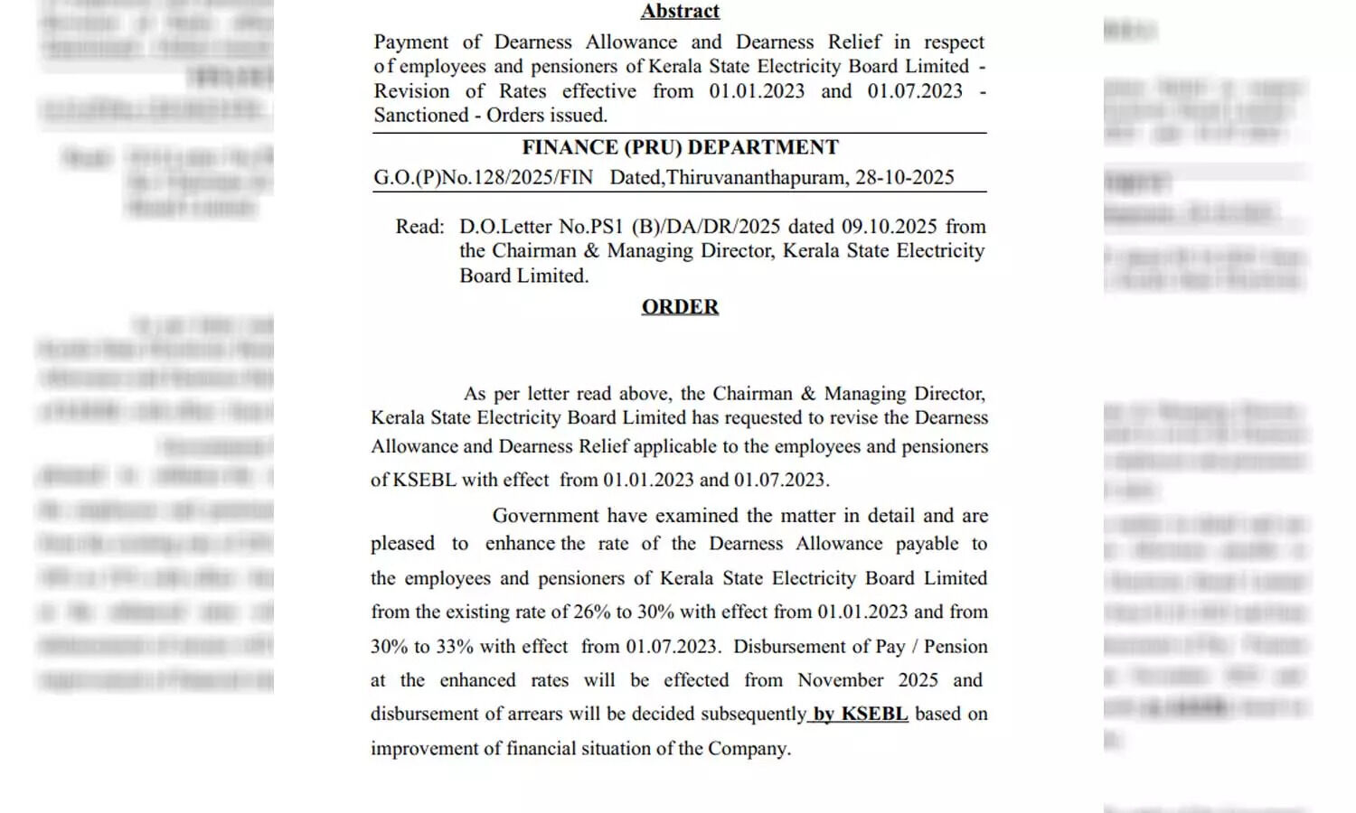 തിരുവനന്തപുരം: കെഎസ്ഇബി ജീവനക്കാര് ഏറെ നാളായി കാത്തിരുന്ന ക്ഷാമബത്തയ്ക്ക് സര്ക്കാര് അനുമതി നല്കി. 2023ലെ ഏഴുശതമാനം ഡിഎ കുടിശ്ശിക നല്കാന് അനുമതി നല്കിക്കൊണ്ടാണ് സര്ക്കാര് ഉത്തരവ്.