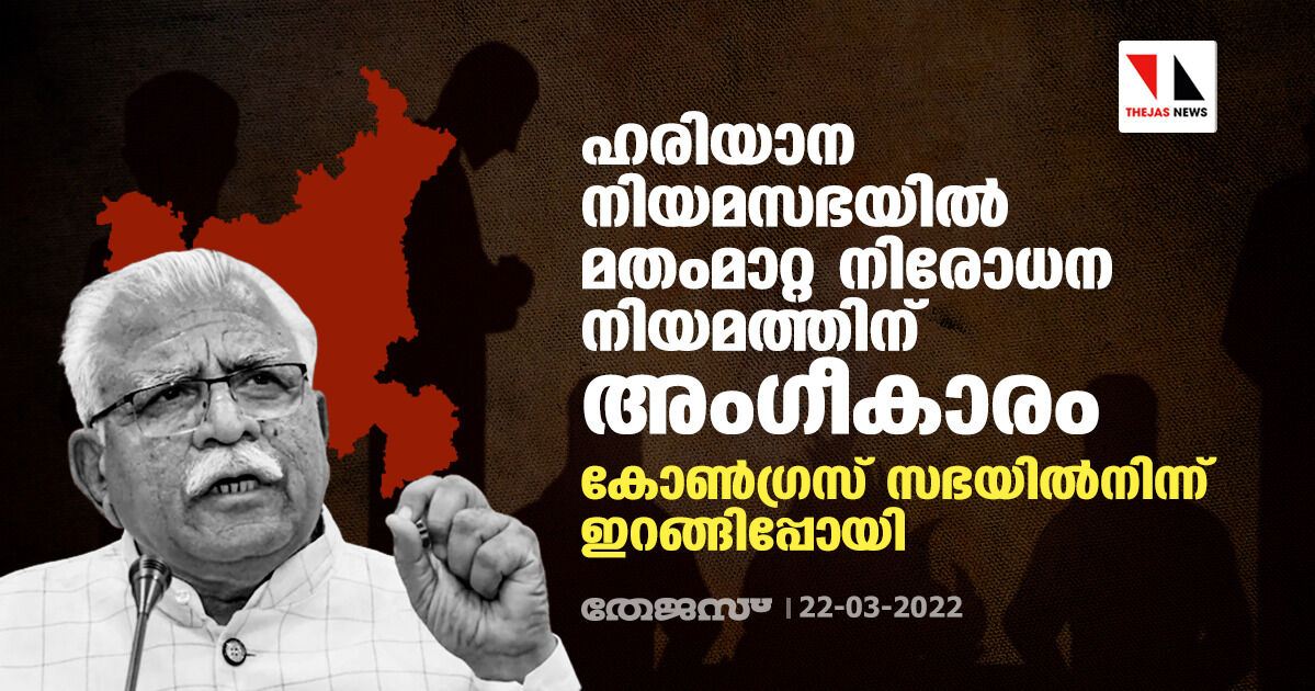 ഹരിയാന നിയമസഭയില് മതംമാറ്റ നിരോധന നിയമത്തിന് അംഗീകാരം; കോണ്ഗ്രസ് അംഗങ്ങള് സഭയില്നിന്ന് ഇറങ്ങിപ്പോയി