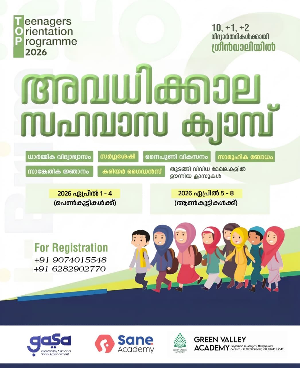 മഞ്ചേരി: മഞ്ചേരി ഗ്രീന്വാലിയില് അവധിക്കാല സഹവാസ ക്യാംപ് സംഘടിപ്പിക്കുന്നു. 10,+1,+2 പഠിക്കുന്ന ആണ് കുട്ടികള്ക്കും പെണ്കുട്ടികള്ക്കുമായി Teenagers Orientation Programme (TOP) എന്നപേരില് ഗ്രീന്വാലി അക്കാദമിയും, ഗ്രീന്വാലി പൂര്വ്വ വിദ്യാര്ഥി കൂട്ടായിമയായ GASA യുമാണ് സംഘടിപ്പിക്കുന്നത്. 2026 ഏപ്രില് 01-04 തീയതികളില് പെണ്കുട്ടികള്ക്ക്, 2026 ഏപ്രില് 05-08 തീയതികളില് ആണ്കുട്ടികള്ക്ക്. ധാര്മ്മിക വിദ്യാഭ്യാസം, സര്ഗ്ഗശേഷി നൈപുണി വികസനം, സാമൂഹിക ബോധം, സാങ്കേതിക ജ്ഞാനം, കരിയര് ഗൈഡന്സ് തുടങ്ങി വിവിധ മേഖലകളില് പ്രഗത്ഭര് നയിക്കുന്ന സെഷനുകളാണ് അവധിക്കാല സഹവാസ ക്യാംപില് സംഘടിപ്പിക്കുന്നത്. പരിമിതമായ സീറ്റുകളിലേക്ക് For registration 62829 02770 എന്ന നമ്പറില് ബന്ധപ്പെടാവുന്നതാണ്.