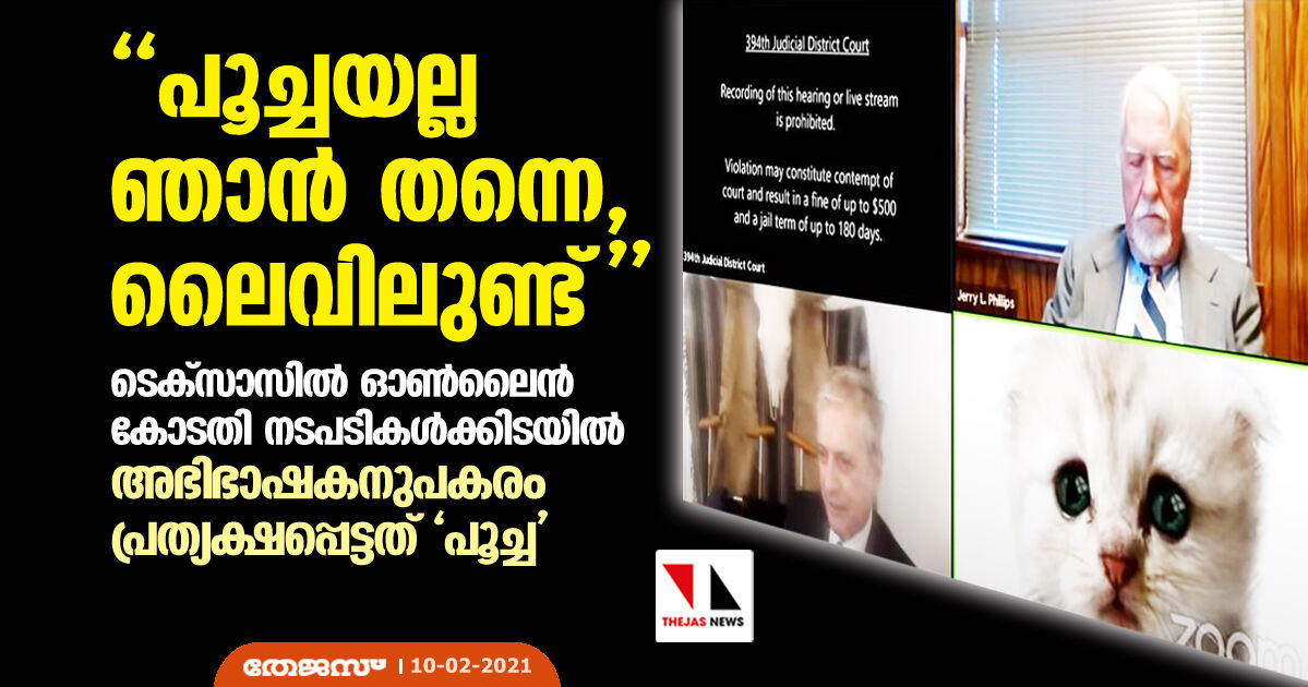 ടെക്സാസിലെ 394ാം ജുഡീഷ്യല് ജില്ലാ കോടതിയില് ഹാജരായ അഭിഭാഷകനായ റോഡ് പോണ്ടന്റെ സ്ഥാനത്ത് ഒരു പൂച്ചയെ കണ്ട ജഡ്ജി കാര്യമാരാഞ്ഞു. തനിക്ക് പകരം സ്ക്രീനില് കാണുന്നത് പൂച്ചയെയാണെന്ന് മനസ്സിലാക്കിയ അഭിഭാഷകന് പറഞ്ഞ മറുപടി ഇപ്പോള് വൈറലാണ്: ഞാന് ഇവിടെയുണ്ട്. ഞാന് പൂച്ചയല്ല- അഭിഭാഷകന് പരിഭ്രാന്തിയോടെ പറഞ്ഞു.