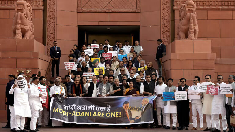 ന്യൂഡല്ഹി: അദാനി വിഷയവുമായി ബന്ധപ്പെട്ട് പാര്ലമെന്റ് പരിസരത്ത് പ്രതിഷേധവുമായി ഇന്ത്യ സഖ്യം. വിഷയത്തില് സംയുക്ത പാര്ലമെന്ററി അന്വേഷണത്തിന് പാര്ട്ടി ആഹ്വാനം ചെയ്യുകയും ചെയ്തു. കോണ്ഗ്രസ്, എഎപി, ആര്ജെഡി, ഡിഎംകെ, ഇടതുപാര്ട്ടികള് തുടങ്ങിയ പാര്ട്ടികളുടെ എംപിമാര് മുദ്രാവാക്യം വിളിക്കുകയും 'മോദിയും അദാനി ഒന്നാണ്' എന്നെഴുതിയ ബാനര് ഉയര്ത്തുകയും ചെയ്തു.