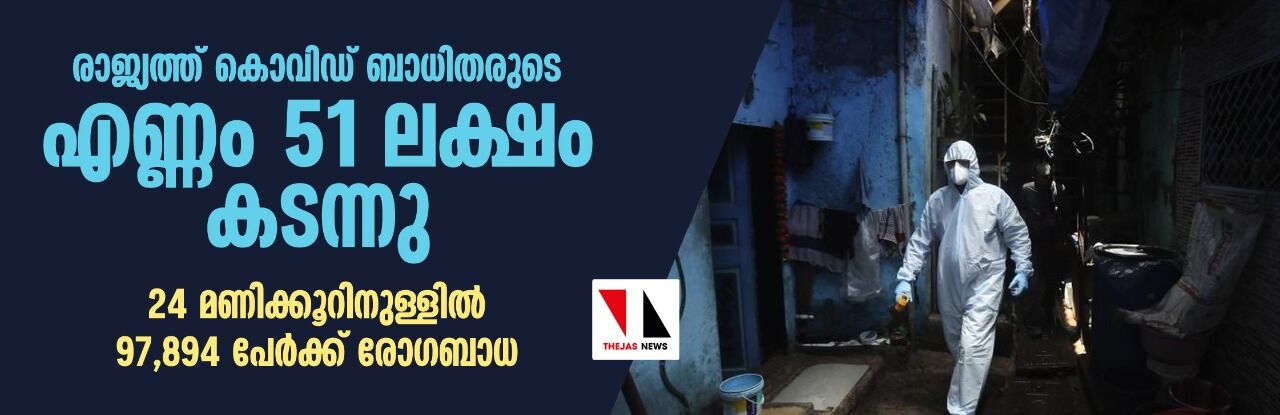 രാജ്യത്ത് കൊവിഡ് ബാധിതരുടെ എണ്ണം 51 ലക്ഷം കടന്നു; 24 മണിക്കൂറിനുള്ളില് 97,894 പേര്ക്ക് രോഗബാധ