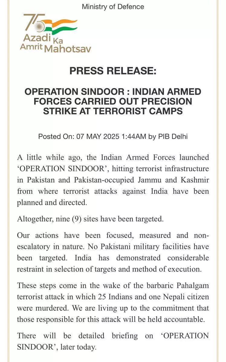 ആക്രമണത്തിൻ്റെ വീഡിയോ ഇന്ത്യൻ ആർമി പുറത്തുവിട്ടു. നീതി നടപ്പായി എന്ന അടിക്കുറപ്പോടെയാണ് വീഡിയോ പങ്കുവച്ചത്. പാക് അധീന കശ്മീരിൽ ഇന്ത്യ മൂന്ന് മിസൈലുകൾ കൊണ്ട് ആക്രമണം നടത്തിയതായി പാകിസ്താൻ വക്താക്കൾ അറിയിച്ചതായി ദി ഹിന്ദു റിപോർട്ട് ചെയ്തു. ഇന്ത്യൻ ആക്രമണത്തിന് തിരിച്ചടി നൽകുമെന്ന് പാകിസ്താൻ വ്യക്തമാക്കി. പഹൽഗാമിൽ 26 പേരെ വെടിവച്ച് കൊന്നതിനു പിന്നാലെ ഇന്ത്യ തിരിച്ചടിക്ക് ഒരുങ്ങുന്നതായി റിപോർട്ടുകളുണ്ടായിരുന്നു. മാത്രമല്ല, രാജ്യത്ത് 250 ഓളം സ്ഥലങ്ങളിൽ ഇന്ന് മോക് ഡ്രില്ല് നടത്തുമെന്നും അറിയിച്ചിരുന്നു.