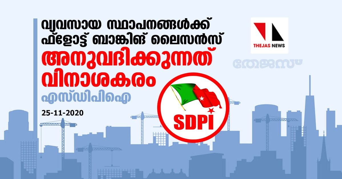 വ്യവസായ സ്ഥാപനങ്ങള്ക്ക് ഫ്ളോട്ട് ബാങ്കിങ് ലൈസന്സ് അനുവദിക്കുന്നത് വിനാശകരം: എസ്.ഡി.പി.ഐ