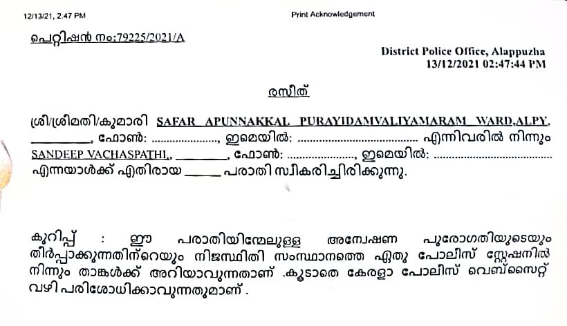 രേഖകളുടെ അടിസ്ഥാനമില്ലാതെ രഹസ്യ അജണ്ടയോടെ നടത്തിയ പ്രസ്താവനകള് ഫേസ് ബുക്ക്, യൂട്യൂബ് ഉല്പ്പെടയുള്ള നവമാധ്യമങ്ങളിലൂടെ പ്രചരിപ്പിക്കുകയും ചെയ്തു. ഇതിനെതിരേ കടുത്ത നടപടി കൈക്കൊള്ളണമെന്നാണ് പരാതിക്കാരന്റെ ആവശ്യം.