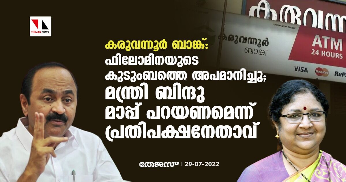 കരുവന്നൂര് ബാങ്ക്: ഫിലോമിനയുടെ കുടുംബത്തെ അപമാനിച്ചു; മന്ത്രി ബിന്ദു മാപ്പ് പറയണമെന്ന് പ്രതിപക്ഷ നേതാവ്