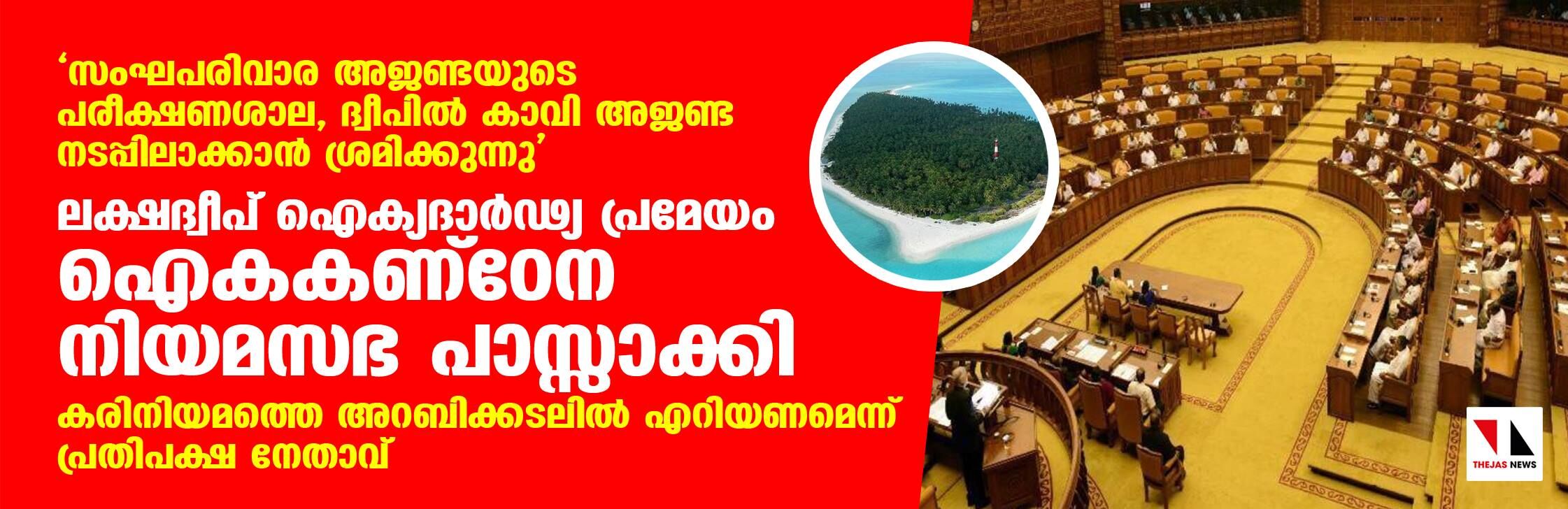 'സംഘപരിവാര അജണ്ടയുടെ പരീക്ഷണശാല, ദ്വീപില് കാവി അജണ്ട നടപ്പിലാക്കാന് ശ്രമിക്കുന്നു'-ലക്ഷ ദ്വീപ് ഐക്യദാര്ഢ്യ പ്രമേയം ഐകകണ്ഠേന നിയമസഭ പാസാക്കി