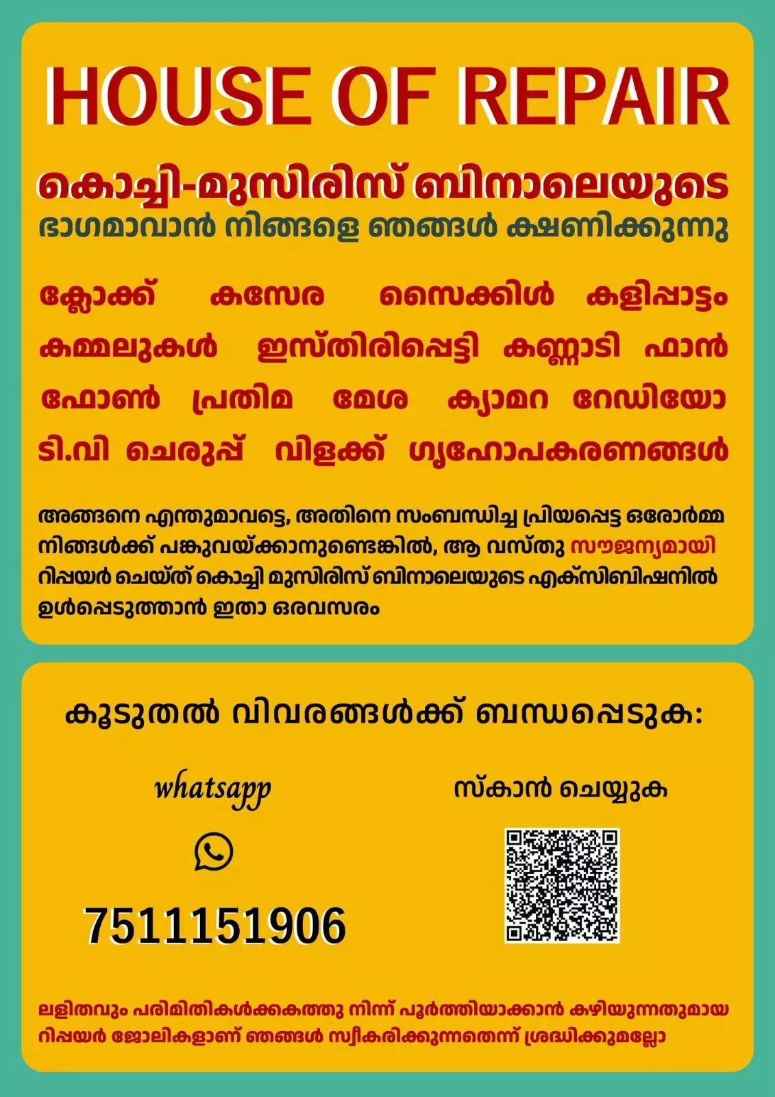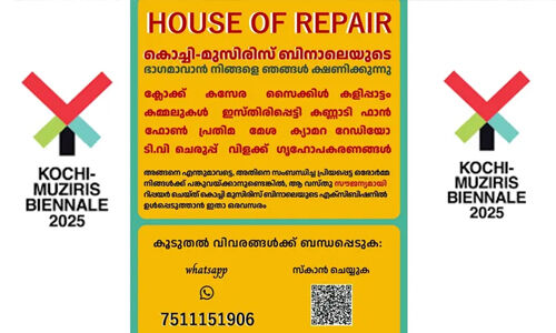 കൊച്ചി മുസിരിസ് ബിനാലെ പ്രവര്ത്തനങ്ങളില് പൊതുജനങ്ങളുടെ പങ്കാളിത്തം വര്ധിപ്പിക്കാനുള്ള കൊച്ചി ബിനാലെ ഫൗണ്ടേഷന്റെ(കെബിഎഫ്) പ്രവര്ത്തനങ്ങളുടെ ഭാഗമായാണ് ഈ തീരുമാനം. ചെറിയ കേടുപാടുള്ള വസ്തുക്കളാണെങ്കില് പരിമിതമായ തോതില് സൗജന്യമായി അവ നന്നാക്കി പ്രദര്ശനത്തില് അവതരിപ്പിച്ചതിനു ശേഷം തിരികെ നല്കും.പ്രദര്ശനത്തിന് ഗൃഹോപകരണങ്ങള് ഉള്പ്പെടുത്താന് താല്പ്പര്യമുളളവര് 7511151906 എന്ന നമ്പറില് ബന്ധപ്പെടണമെന്ന് കെബിഎഫ് അറിയിച്ചു. പ്രശസ്ത കലാകാരനായ നിഖില് ചോപ്ര ക്യൂറേറ്റ് ചെയ്യുന്ന കൊച്ചി ബിനാലെ ആറാം ലക്കം ഡിസംബര് 12ന് ആരംഭിച്ച് 110 ദിവസത്തെ പ്രദര്ശനത്തിനു ശേഷം മാര്ച്ച് 31ന് സമാപിക്കും. ഫോര് ദി ടൈം ബീയിംഗ് എന്നതാണ് ആറാം ലക്കത്തിന്റെ ക്യൂറേറ്റര് പ്രമേയം.