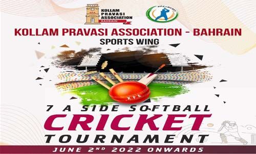 ബഹ്റൈന്:കൊല്ലം പ്രവാസി അസോസിയേഷന് സ്പോര്ട്സ് വിങ് ബഹ്റൈന് ക്രിക്കറ്റ് ഫെഡറേഷന്റെ അംഗീകാരത്തോടെ 7 എ സൈഡ് സോഫ്റ്റ് ബോള് ക്രിക്കറ്റ് ടൂര്ണമെന്റ് സംഘടിപ്പിക്കുന്നു.ജുഫൈര് അല് നജുമ ക്ലബ്ബില് വെച്ചാണ് ടൂര്ണമെന്റ് സംഘടിപ്പിക്കുന്നത്.