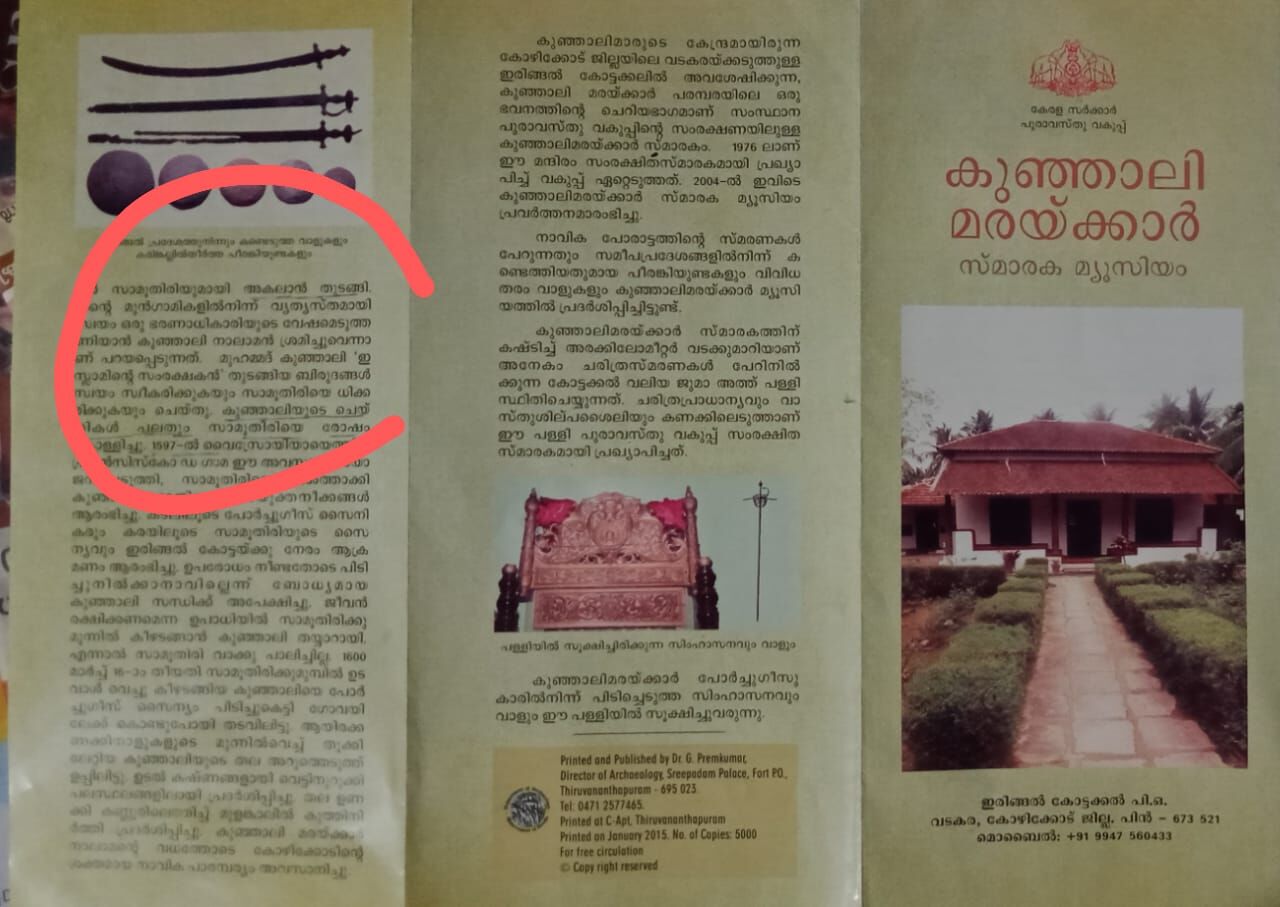 ഏഴ് വര്ഷം കഴിഞ്ഞിട്ടും വികല പരാമര്ശം മാറ്റാതെ കുഞ്ഞാലി മരയ്ക്കാര് ലഘുലേഖ