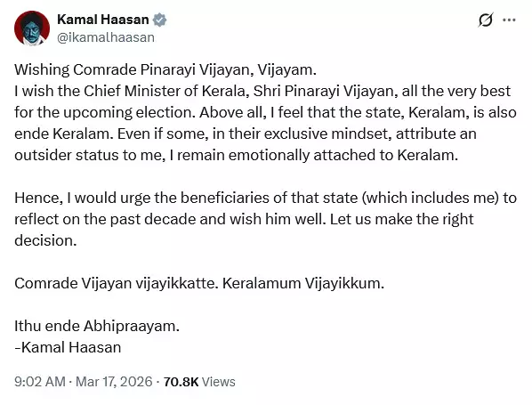 'സഖാവ് പിണറായി വിജയന് വിജയം ആശംസിക്കുന്നു. വരുന്ന നിയമസഭാ തിരഞ്ഞെടുപ്പില് കേരളത്തിന്റെ മുഖ്യമന്ത്രി പിണറായി വിജയന് വിജയാശംസകള് നേരുന്നു. എല്ലാത്തിനുമുപരി കേരളം എന്റെ നാടുകൂടിയാണ്. ചിലരുടെയെങ്കിലും മനസില് ഞാന് പുറത്തുനിന്നുള്ള ഒരാളാണെന്ന തോന്നലുണ്ടായാല്പ്പോലും കേരളവുമായുള്ള വൈകാരിക ബന്ധം ഞാനെന്നും സൂക്ഷിക്കാറുണ്ട്. അതുകൊണ്ട് കഴിഞ്ഞ പത്തുവര്ഷത്തെക്കുറിച്ച് ചിന്തിക്കാനും അദ്ദേഹത്തിന് ആശംസകള് നേരാനും കേരളത്തിലെ ജനങ്ങളോട് ഞാന് അഭ്യര്ത്ഥിക്കുന്നു. നമുക്ക് ശരിയായ തീരുമാനമെടുക്കാം. സഖാവ് വിജയന് വിജയിക്കട്ടെ, കേരളവും വിജയിക്കും. ഇത് എന്റെ അഭിപ്രായം.' എന്ന് കമല് ഹാസന് കുറിച്ചു.